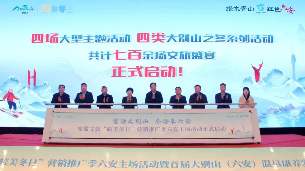 周明洁、魏武等领导共同推杆,正式启动“童话大别山 冬游来六安”安徽宝威体育 “皖美冬日”营销推广季六安主场活动。六安市将通过线上线下相结合的方式,举办中国红色微电影盛典、首届大别山红色旅游创意创新设计大赛、首届六安市滑雪嘉年华等四场大型主题活动和“冬韵、冬味、冬行、冬享”四类共700余场活动,整合大别山山水风光、冰雪休闲、温泉养生、中医药食等资源优势,精心打造多样化“皖美冬日”旅游产品,全方位展示六安的自然风光、历史文化、民俗风情和特色美食,为广大游客呈现一场精彩纷呈、流连忘返的温泉康养“皖美之旅”。