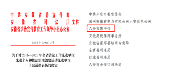 六安市图书馆获评“2016-2020年全省普法工作先进单位”
