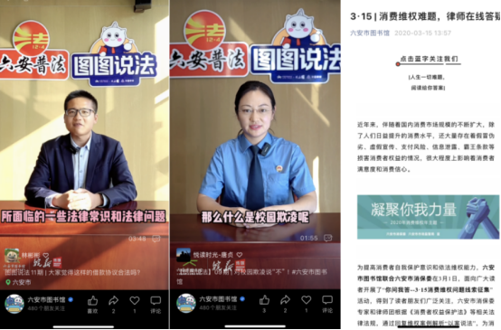 近年来,六安市图书馆深入学习宣传贯彻习近平新时代中国特色社会主义思想,认真落实“七五”普法要求,履行社会教育职能,策划开展线上、线下普法活动。以宣传教育为切入点,开展“图图说法”“皋陶法治文化解读”“法律问诊所”“皋城公开课”“身边的《民法典》”“宪法宣传周”等法律专题讲座、青少年法治宣传培训共30余场。在“3.15”国际消费者权益保护日、“12·4”国家宪法日等重要节点采用专家讲座、案例互动等形式,向广大市民进行普法宣传。同时,馆内设立了皋陶法律专区,配备法律相关馆藏图书8000余册,全方位搭建学法、知法、守法的学习平台。
